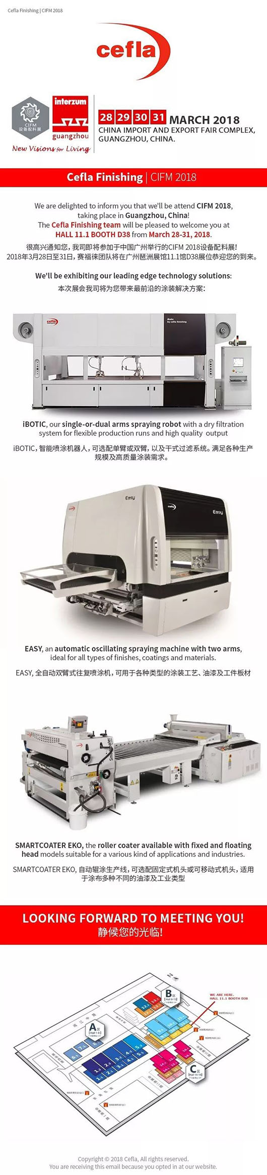 我們的合作伙伴意大利賽福徠CEFLA即將參加2018年廣州國際家具生產(chǎn)設(shè)備及配料展覽會(huì)(INTERZUM/CIFM 2018)。