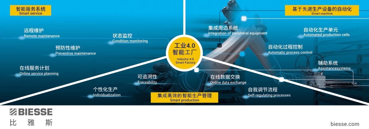 科技以賦能,智造創(chuàng)未來(lái),Biesse(比雅斯)致力于將行業(yè)愿景變?yōu)楝F(xiàn)實(shí),推出達(dá)到工業(yè)4.0需求的管理軟件和服務(wù)平臺(tái),結(jié)合自動(dòng)化系統(tǒng),軟件與硬件相結(jié)合,助力企業(yè)重構(gòu)生產(chǎn)方式,實(shí)現(xiàn)工業(yè)4.0。